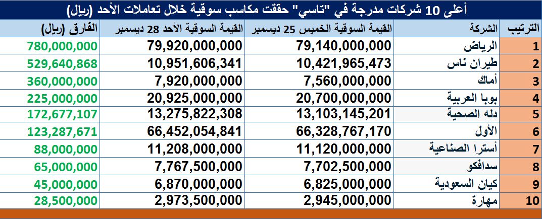 وتصدر بنك "الرياض" الأسهم التي حققت ارتفاعا في قيمتها السوقية خلال تعاملات اليوم الأحد بزيادة بلغت 780 مليون ريال، تلاه "طيران ناس" بزيادة قيمتها 529.64 مليون ريال، ثم "أماك" بواقع 360 مليون ريال.