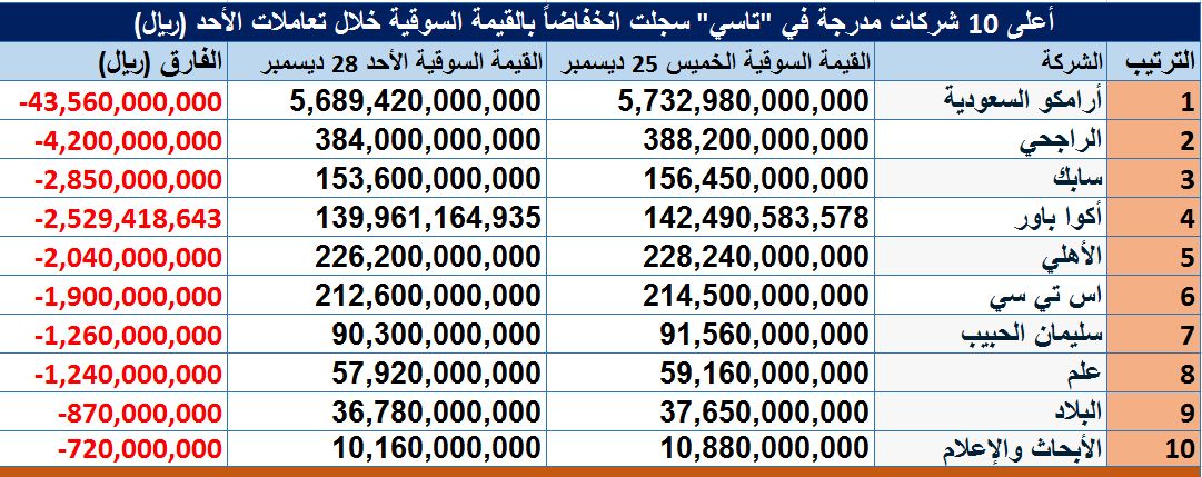 وحلت "أرامكو السعودية" على رأس 234 شركة سجلت انخفاضا بقيمتها السوقية خلال تعاملات اليوم الأحد؛ بواقع 43.56 مليار ريال، تلاها "الراجحي" بواقع 4.2 مليار ريال، ثم "سابك" بانخفاض قيمته 2.85 مليار ريال.