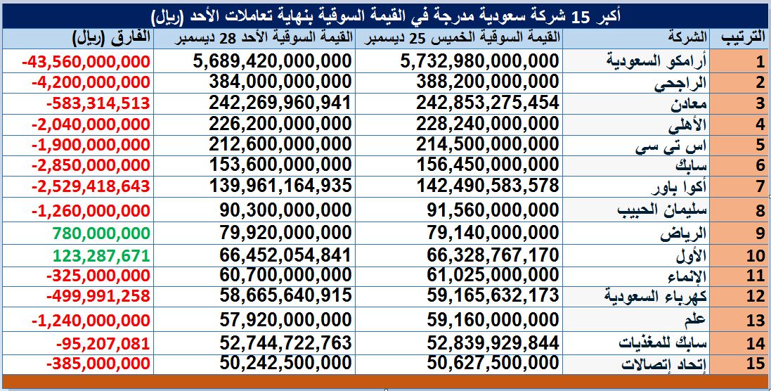 أكبر 15 شركة مدرجة في "تاسي" بالقيمة السوقية