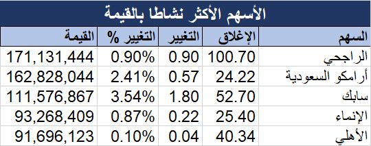 وتصدر سهم "الراجحي" الأسهم النشطة من حيث القيمة بـ 171.13 مليون ريال، وأغلق مرتفعا 0.9%، وكان المركز الثاني لسهم "أرامكو السعودية" بقيمة بلغت 162.83 مليون ريال، وصعد السهم 2.41%.