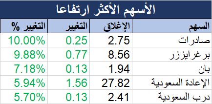 وعلى صعيد أداء الأسهم، شملت المكاسب 230 سهما تصدرها سهم "صادرات" بارتفاع نسبته 10%، تلاه سهم "برغرايززر"، بنسبة ارتفاع بلغت 9.88%.