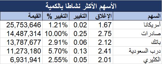 وعلى صعيد أعلى الكميات جاء سهم "أمريكانا" في الصدارة، بكمية تداول بلغت 25.75 مليون سهم، وحل سهم "صادرات" ثانيا بـ 14.49 مليون سهم.