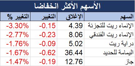 واقتصرت قائمة الخسائر على 33 سهما، بصدارة سهم "اليمامة للحديد" (على صعيد الأسهم)، الذي هبط 1.67%، تلاه سهم "جاز"، بنسبة تراجع بلغت 1.47%.