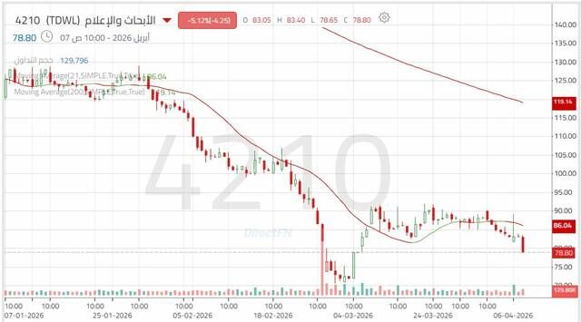 سهم "الأبحاث والإعلام" في اتجاه هابط وسط استمرار الضغوط البيعية, اليوم الثلاثاء 7 أبريل 2026 02:13 مساءً