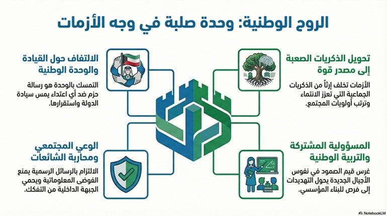 وفي هذا السياق، تتجلى الوطنية الحقة في الالتزام بالقانون واحترام الإجراءات الرسمية والامتناع عن أي خطاب أو سلوك قد يربك المجتمع أو يضعف تماسكه. إن قوة الكويت في مواجهة هذه التحديات لا تقوم فقط على قدراتها الأمنية والعسكرية، بل على وحدة شعبها وثقته بقيادته السياسية ومؤسساته الوطنية. فالوقوف صفا واحدا خلف القيادة السياسية ودعم جهود أجهزة الدولة يمثلان ركيزة أساسية لحماية الاستقرار وتعزيز الأمن الوطني في ظل الظروف الراهنة.