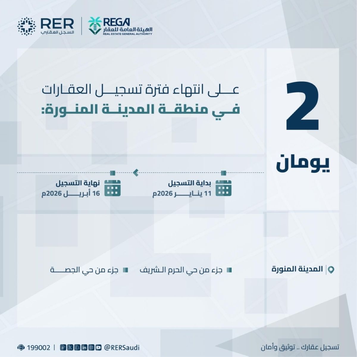 انتهاء مدة تسجيل العقارات لـ27 قطعة عقارية في مكة والمدينة غدا, اليوم الثلاثاء 14 أبريل 2026 09:01 مساءً