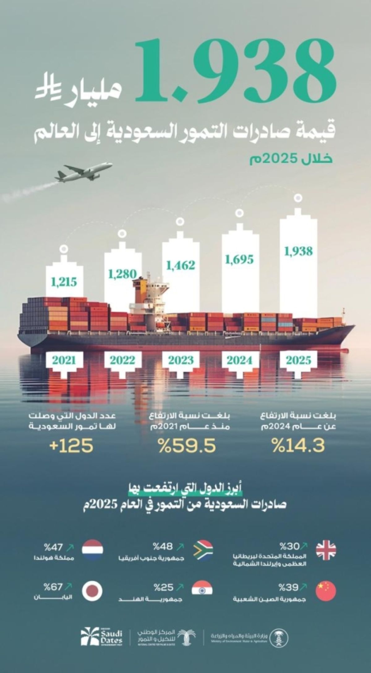 وأوضح وزير البيئة والمياه والزراعة رئيس مجلس إدارة المركز الوطني للنخيل والتمور المهندس عبدالرحمن بن عبدالمحسن الفضلي، أن هذا الإنجاز يأتي نتيجة للدعم اللامحدود الذي يحظى به القطاع من قِبل القيادة الرشيدة - أيدها الله -، إلى جانب التنسيق والتكامل بين الجهات الحكومية والقطاع الخاص، لتطوير سلاسل الإمداد، وتعزيز كفاءة التصدير، وتوسيع حضور التمور السعودية في الأسواق العالمية، مشيرا إلى أن مبادرة «تمكين صادرات التمور السعودية ودخولها للأسواق العالمية»، شكلت الركيزة الأساسية لتحقيق هذا الإنجاز، وتوسيع نطاق صادرات التمور السعودية وتعزيز انتشارها في الأسواق العالمية، حيث ارتفعت الصادرات إلى العديد من الدول مقارنة بـ2024م.