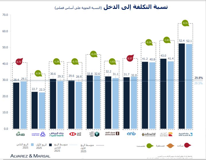 وفي حين تراجع صافي هامش الفائدة بمقدار 8 نقاط أساس ليصل إلى 2.80% بسبب ارتفاع تكاليف التمويل، أظهرت البنوك مرونةً كبيرة عبر الإدارة الفعالة للتكاليف، فتحسّنت نسبة التكلفة إلى الدخل الإجمالية بمقدار 30 نقطة أساس لتصل إلى 29.5%، حيث أبلغت 8 من أصل 10 بنوك عن تحقيق مستويات أعلى من الكفاءة.