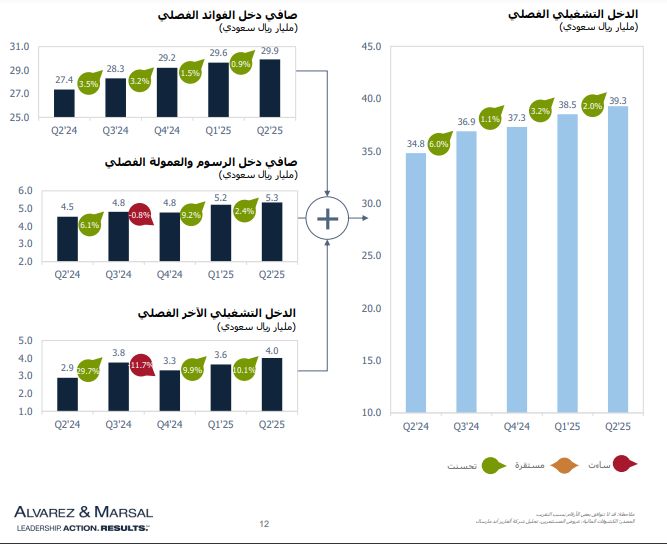 وسجل الدخل التشغيلي ارتفاعاً بنسبة 2% على أساس فصلي؛ ليصل إلى 39.3 مليار ريال سعودي، مسجلاً الارتفاع الفصلي الخامس على التوالي، وجاء هذا الارتفاع مدعوماً بزيادة قدرها 5.6% في الدخل من غير الفوائد؛ مما يعكس نشاطاً أقوى في قطاعات التمويل التجاري وإدارة الثروات والمدفوعات.