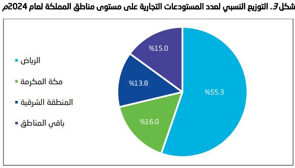 وتوزعت هذه المستودعات على مستوى المناطق الإدارية، وكانت منطقة الرياض الأعلى من حيث عدد رخص المستودعات التجارية والمساحة، بعدد 6763 مستودعا تجاريا، وإجمالي مساحة بلغت 10.7 ملايين متر مربع، تشكل نسبة 55.3% من إجمالي المستودعات التجارية المرخصة في المملكة.