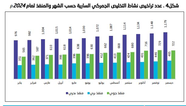 وشهد عام 2024م ارتفاعًا في عدد تراخيص التخليص الجمركي السارية في مختلف المنافذ؛ حيث بلغ إجمالي عدد التراخيص في المنافذ البحرية في نهاية العام 1179 رخصة، مسجلا زيادة نسبتها 26.1% مقارنة بالفترة نفسها من عام 2023م.