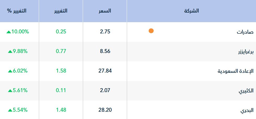 وارتفع خلال تلك اللحظة 221 سهما، تصدرهم صادرات بنسبة 10%، وتلاه سهم "برغرايززر" بنسبة 9.88%.
