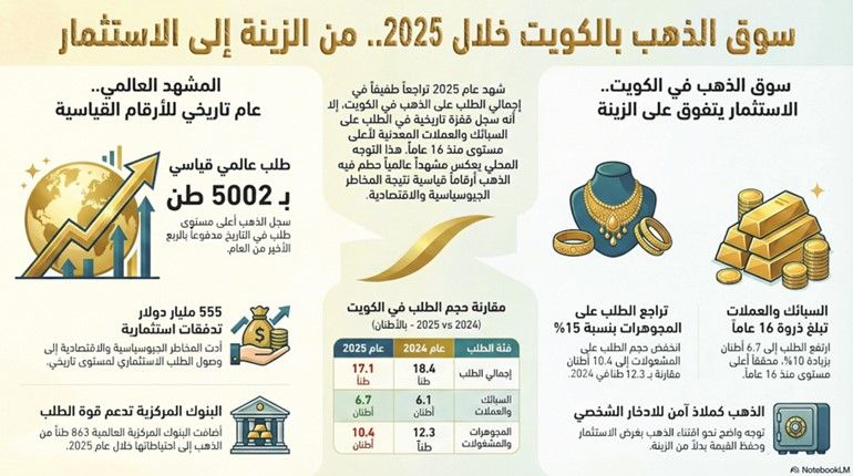كشفت أحدث بيانات صادرة عن مجلس الذهب العالمي، أن إجمالي حجم الطلب على الذهب في الكويت سجل مستوى 17.1 طنا خلال عام 2025، بتراجع سنوي نسبته 7%، مقارنة بمعدل الطلب على المعدن الأصفر في البلاد خلال عام 2024 والبالغ 18.4 طنا.