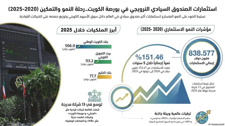 وتعكس هذه الزيادة استمرار المسار التصاعدي لاستثمارات أكبر صندوق سيادي بالعالم داخل السوق الكويتي، حيث سجلت استثماراته نموا متراكما واضحا على مدى السنوات الماضية، مرتفعة من 333.47 مليون دولار في عام 2020 إلى 838.577 مليون دولار في 2025، محققة نموا إجماليا بلغت نسبته 151.46% خلال 5 سنوات.