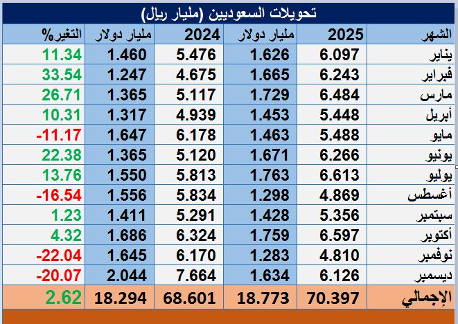 وعلى أساس شهري، ارتفعت قيمة تحويلات السعوديين خلال شهر ديسمبر/ كانون الأول الماضي بنسبة 27.4% عن قيمة التحويلات في شهر نوفمبر/ تشرين الثاني 2025م والبالغة 4.81 مليار ريال (1.28 مليار دولار).