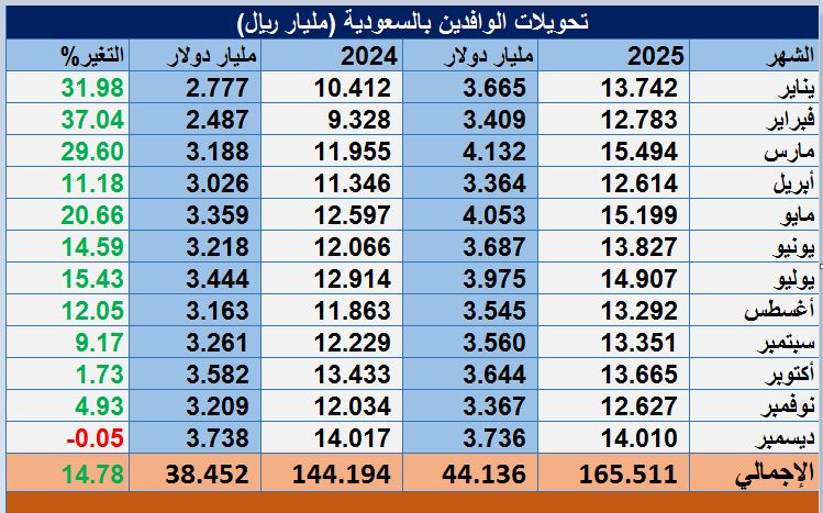وارتفعت تحويلات الوافدين؛ وفقاً لإحصائية أعدها "مباشر" تستند لبيانات النشرة الشهرية للبنك المركزي السعودي "ساما"، إلى 165.51 مليار ريال (44.14 مليار دولار) في عام 2025م، وتعتبر أعلى مستوى للتحويلات تاريخياً، مقابل 144.2 مليار ريال (38.45 مليار دولار) في عام 2024م.