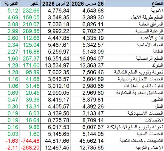مباشر - ثابت شحاتة: شهد سوق الأسهم السعودية ارتفاعاً ملحوظاً خلال الأسبوع المنتهي في 2 أبريل 2026، في ظل صعود شبه جماعي للقطاعات، وسط تحسن السيولة مقارنة بالأسبوع السابق.