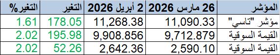 مؤشر "تاسي" يسجل مكاسب أسبوعية 1.61%.. والقيمة السوقية تربح 196 مليار ريال, اليوم الخميس 2 أبريل 2026 06:33 مساءً