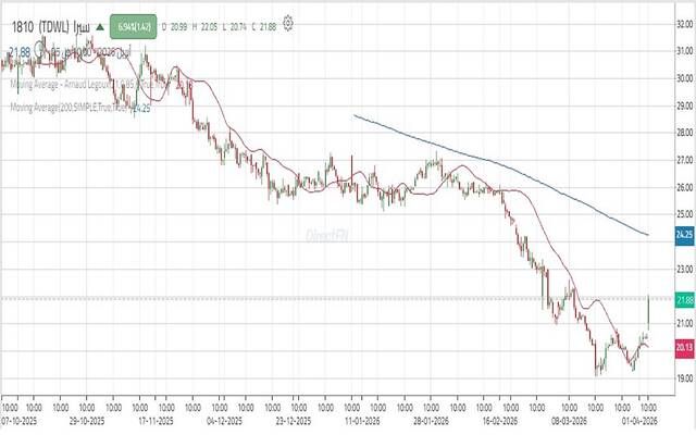 ونجح السهم في اختراق مستوى دعم رئيسي حول 25.00. مما أدى إلى استمرار الضغوط البيعية نحو الدعم الرئيسي عند 20.70، ونجح السعر في الاستقرار دون مستوى الدعم؛ وهو ما يشير إلى فقدان التوازن السعري عند تلك المنطقة.