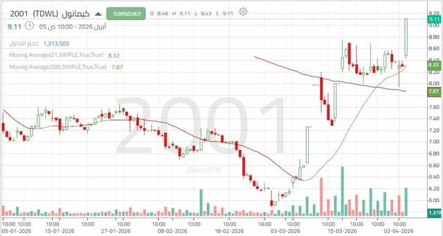 سهم "كيمانول": إشارات فنية داعمة لاستمرار الحركة التصحيحية الصاعدة, اليوم الأحد 5 أبريل 2026 11:13 صباحاً
