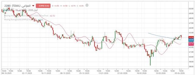 إلا أن بداية شهر أبريل شهدت بوادر تحسن إيجابي، مع اقتراب السهم من اختراق مستوى مقاومة 44.50 ريال؛ وهو ما قد يمثل نقطة تحول فنية تدعم الخروج من الضغوط البيعية التي أثرت على السهم خلال الفترة الماضية، وتعزز فرص استعادة الاتجاه الصاعد خلال الفترة المقبلة.