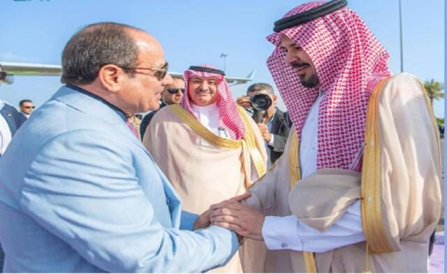 وكان في استقبال السيسي لدى وصوله مطار الأمير محمد بن عبدالعزيز الدولي، الأمير سلمان بن سلطان بن عبدالعزيز أمير منطقة المدينة المنورة، وأمين منطقة المدينة المنورة المهندس فهد بن محمد البليهشي، ومدير شرطة المنطقة اللواء يوسف عبدالله الزهراني، ومدير مكتب المراسم الملكية بالمنطقة إبراهيم بن عبدالله برّي، وعدد من المسؤولين، وفقا لوكالة أنباء السعودية "واس".
