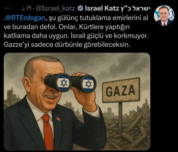 وقال كاتس في تغريدة عبر منصة X: "خذ أحكامك السخيفة وارحل من هنا، إنها أنسب للمجازر التي ارتكبتها بحق الأكراد. إسرائيل دولة قوية لا تخشى شيئًا، ولن ترى غزة إلا من خلال المنظار"، في إشارة إلى رفض تل أبيب للوجود التركي في قوة دعم الاستقرار المزمع نشرها في قطاع غزة.