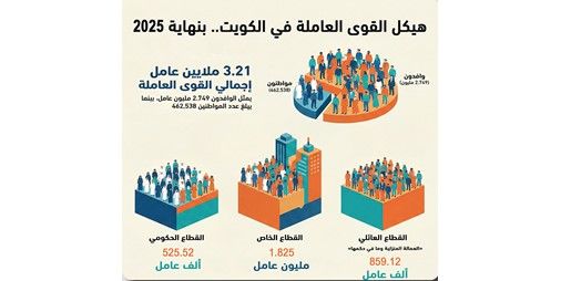 أظهرت البيانات الرسمية أن إجمالي حجم القوى العاملة في الكويت بلغ 3.21 ملايين عامل وعاملة بنهاية 2025، من بينهم 462.538 ألف مواطن ومواطنة، مقابل 2.749 مليون عامل وعاملة من المقيمين.