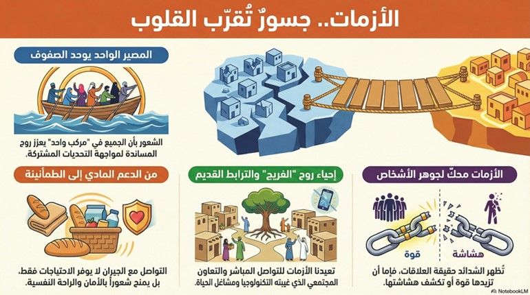 في أوقات الأزمات حين تضيق المسافات وتتسارع الاحداث، لا يبقى للإنسان سوى دوائره الأقرب.. العائلة والجيران، ومع تصاعد التوترات الإقليمية ومنها أزمة الحرب الدائرة حاليا تتجه الأنظار إلى المجتمع من الداخل، فعادة في ظل ظروف مشابهة تظهر ملامح جديدة للتكافل والتلاحم، حيث تتحول الأبواب المغلقة إلى مساحات مفتوحة للدعم والمساندة، فهل فعلا تعيد الأزمات إحياء الروابط الأسرية والاجتماعية أم تكشف هشاشتها؟ وهل تعيد هذه الأزمات تشكيل العلاقات الإنسانية فتقرب بين الجيران بعد ان فرقتهم مشاغل الحياة؟