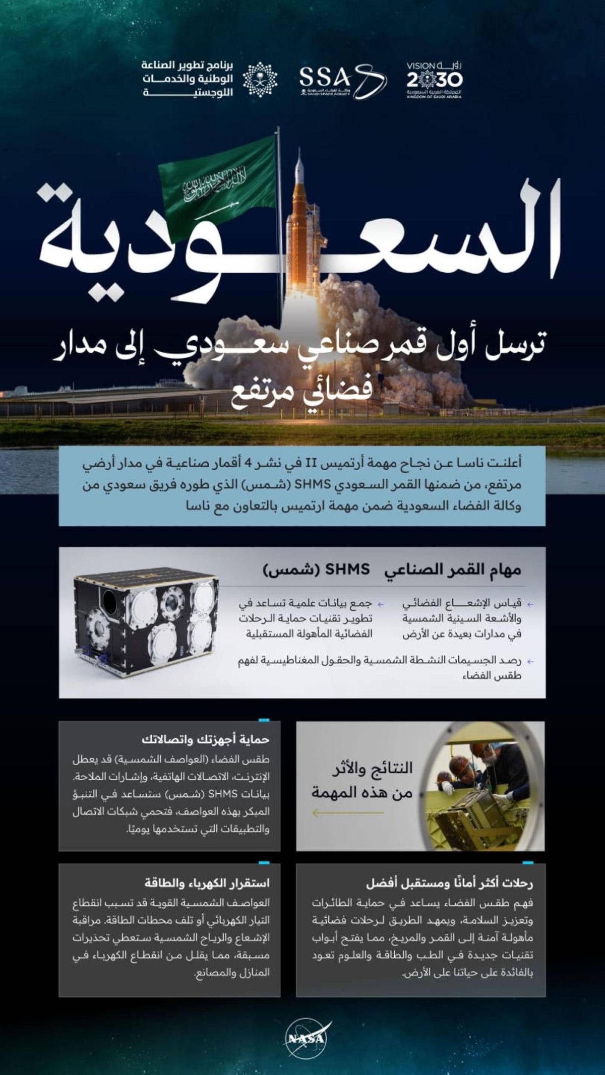 أعلنت وكالة الفضاء السعودية نجاح الإطلاق والتواصل مع القمر الصناعي السعودي «شمس» الذي انطلق على متن مركبة نظام الإطلاق الفضائي (SLS) ضمن مهمة «آرتميس 2 »، لتسجل المملكة بذلك حضورها أول دولة عربية تطلق مهمة فضائية ضمن برنامج «أرتميس» التاريخي، الذي يهدف إلى تسريع وتيرة الابتكار العلمي وترسيخ شراكات دولية نوعية تسهم في تشكيل مستقبل الفضاء لأجل البشرية.